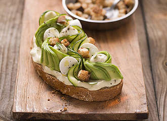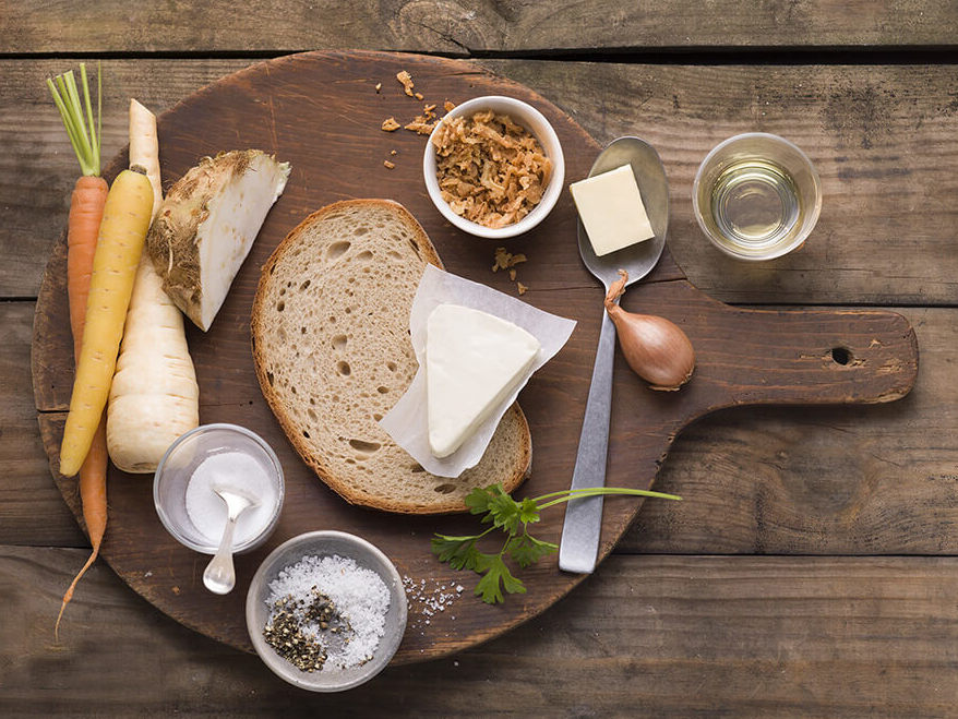 Den Backofen auf 180°C vorheizen. Das Gemüse putzen, schälen und in mundgerechte Stücke schneiden. Mit Salz, Pfeffer und etwas Zucker würzen. Mit dem Öl mischen und in einer Auflaufform im Ofen 30-40 Min. rösten. Zum Schluss die Butter unterrühren und etwas abkühlen lassen. Die Petersilienblätter abzupfen, waschen und trocken tupfen. Die Kräutercreme in einer Schüssel glattrühren und in einer Spritzbeutel mit kleiner Lochtülle füllen. Die Brotscheiben mit jeweils etwas Schmorgemüse belegen. Kleine Tupfen von der Kräutercreme darauf spritzen. Mit Petersilienblättchen und Röstzwiebeln bestreut servieren.