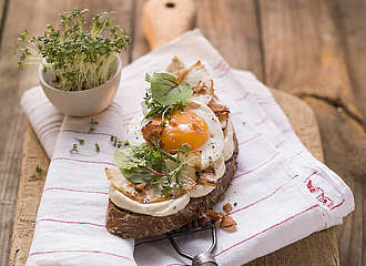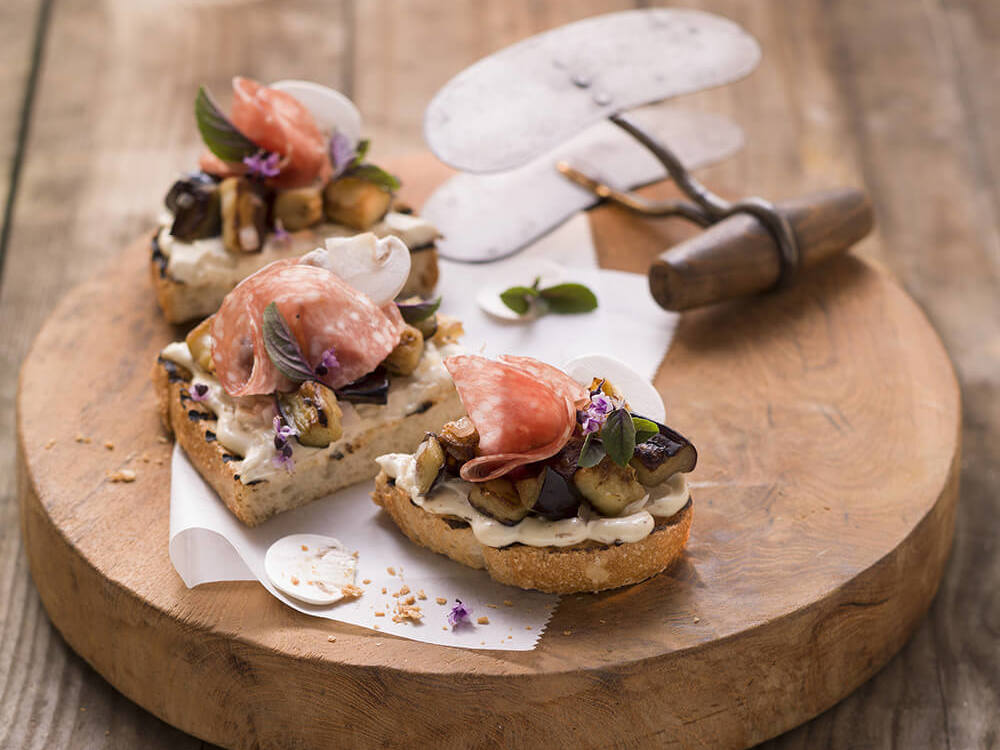 Die Brotscheiben in einer großen Pfanne oder Grillpfanne von beiden Seiten goldbraun rösten und abkühlen lassen. Edelcreme in einer kleinen Schüssel glatt rühren. Die Brotscheiben jeweils mit etwas Creme bestreichen. Die Schalotten schälen, halbieren und fein würfeln. Aubergine waschen und in 1,5 cm große Würfel schneiden. Mit etwas Salz würzen, Wasser ziehen lassen und dann trocken tupfen. Das Öl erhitzen und die Auberginen gut anbraten. Dann Schalotten dazugeben und bei niedriger Hitze weich schmoren lassen. Mit Salz, Pfeffer und Rosmarin würzen. Die Champignons putzen und in feine Scheiben schneiden oder hobeln. Basilikumblätter waschen und abzupfen. Den Rest der Creme in einen Spritzbeutel mit kleiner Lochtülle füllen. Die Brotscheiben jeweils mit Auberginen, Salami, Basilikumblätter sowie den Edelcremetupfen belegen und servieren.