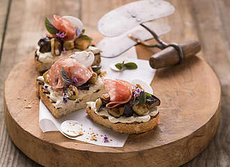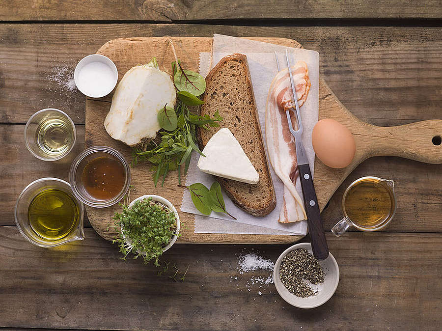Den Backofen auf 180°C vorheizen. Den Sellerie putzen, schälen, vierteln und in 0,5 cm dicke Scheiben schneiden. Mit Salz, Pfeffer und etwas Zucker würzen. Mit 1 El. Öl mischen und in einer Auflaufform im Ofen 20-30 Min. rösten, anschließend etwas abkühlen lassen. Das restliche Öl in einer Pfanne erhitzen und den Speck darin knusprig braten. Auf Küchenpapier abtropfen lassen. Im Bratfett die Eier aufschlagen und braten. Den Speck dann in feine Stücke hacken. Die Kräuterblätter waschen, trocken tupfen und grob zupfen. Die Kresse mit einer Schere schneiden und mit den Kräutern in eine Schüssel geben. Essig, Honig und Olivenöl mischen. Mit Salz und Pfeffer würzen und den Kräutersalat damit marinieren. Die Brotscheiben mit der Edelcreme bestreichen und mit je einem Spiegelei belegen. Mit Kräutersalat und Baconstücken bestreut servieren.
