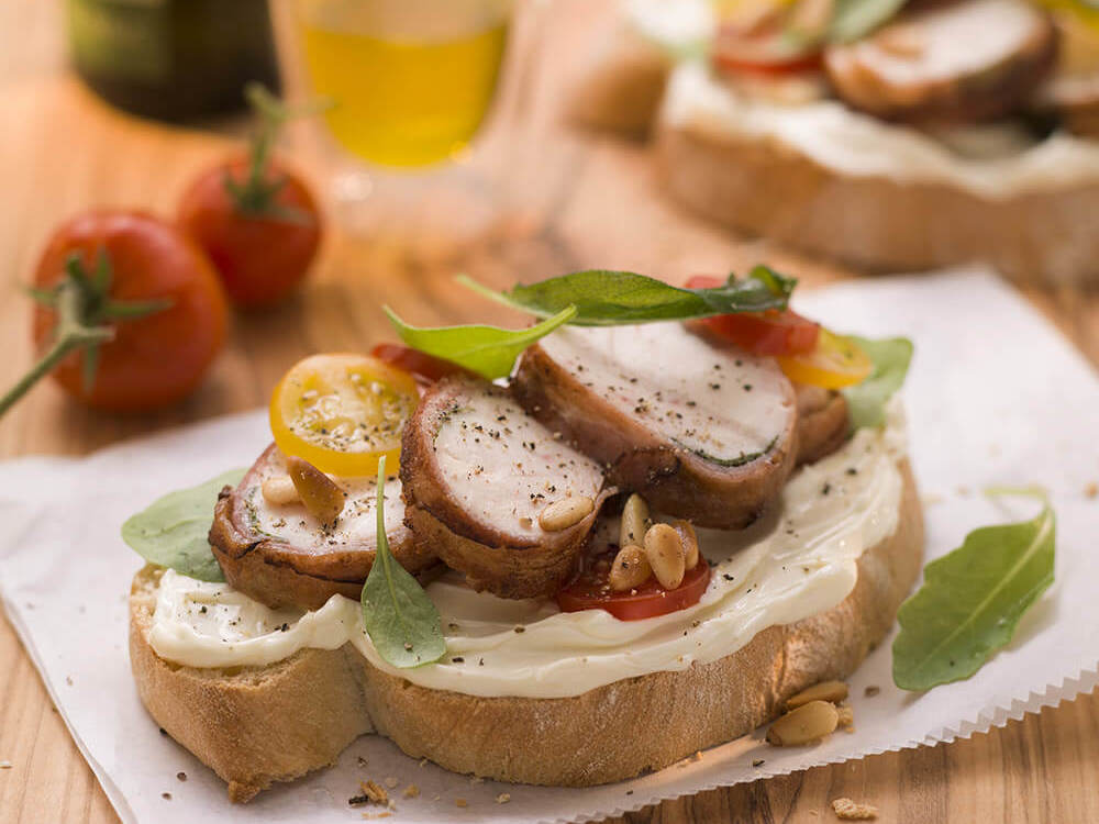 Den Backofen auf 140°C vorheizen. Die Hähnchenbrustfilets waschen und trocken tupfen. Mit wenig Salz und Pfeffer würzen und mit jeweils 2 Salbeiblättern belegen. Dann in den Frühstücksbacon einwickeln. Das Öl in einer Pfanne erhitzen und die Saltimbocca 2-3 Min. bei mittlerer Hitze knusprig braten. Im Ofen 6-8 Min. zu Ende garen. Die Kirschtomaten waschen und in Scheiben schneiden. Den Rucola waschen und trocken tupfen. Den restlichen Salbei und die Pinienkerne im Bratenfett kurz anrösten. Die Toskanabrotscheiben jeweils mit der Sahnecreme bestreichen. Die Saltimbocca in dünne Scheiben aufschneiden und mit den Tomatenscheiben und dem Rucola belegen. Mit Salbei und Pinienkernen bestreut servieren.