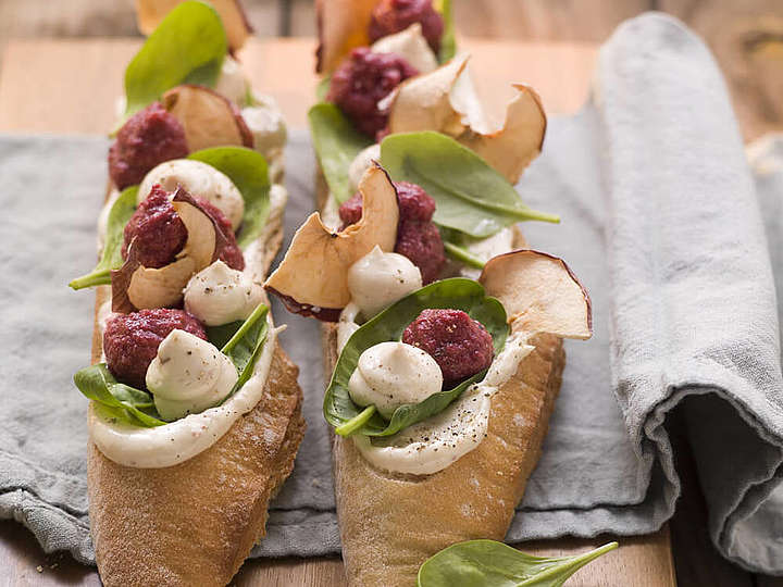 Baguette mit Rote-Beete-Püree, Jungem Spinat, Meerrettich und Apfelchips