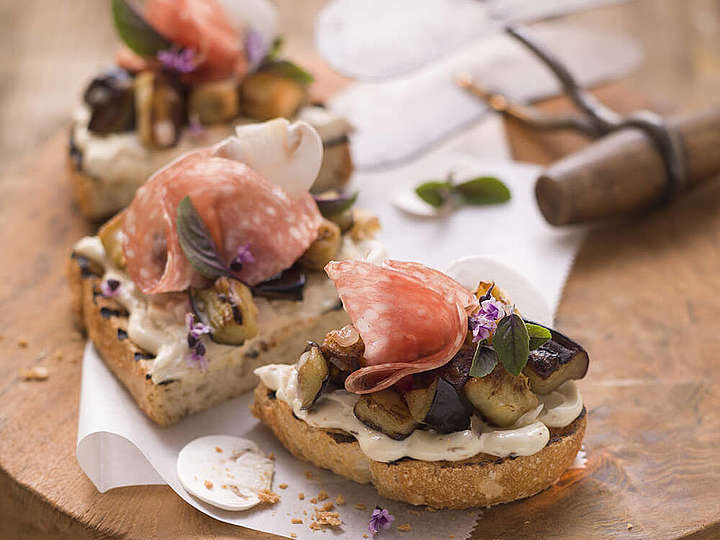 Ital. Bauernbrot, Aubergine, Fenchelsalami, Champignons und Basilikum