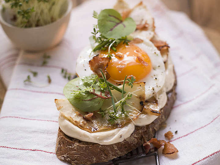 Mischbrot , geschmorter Sellerie, Spiegelei, Kräutersalat und Speck