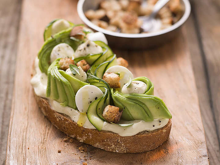 Kartoffelbrot mit Avocado, Zucchini, Thymiancroutons und Mozzarella