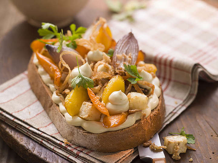 Doppelt gebackenes Wurzelgemüse mit Röstzwiebeln und Petersilie