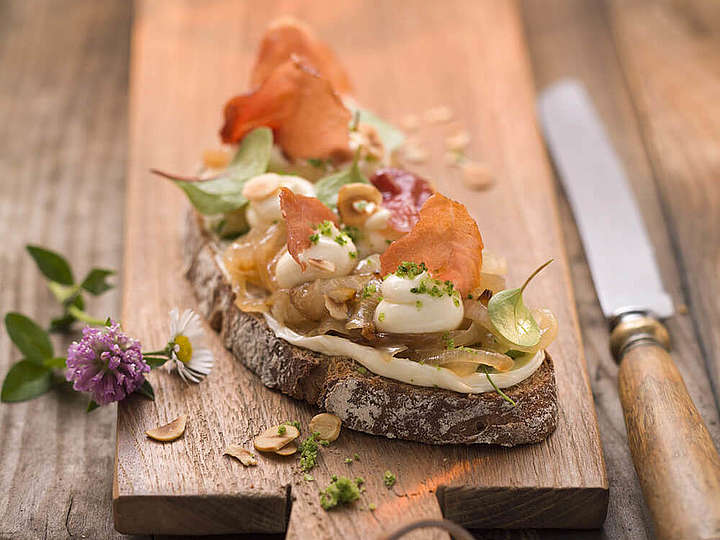 Bauernbrot mit geschmolzenen Zwiebeln, Schinkenchips und Petersiliensalz