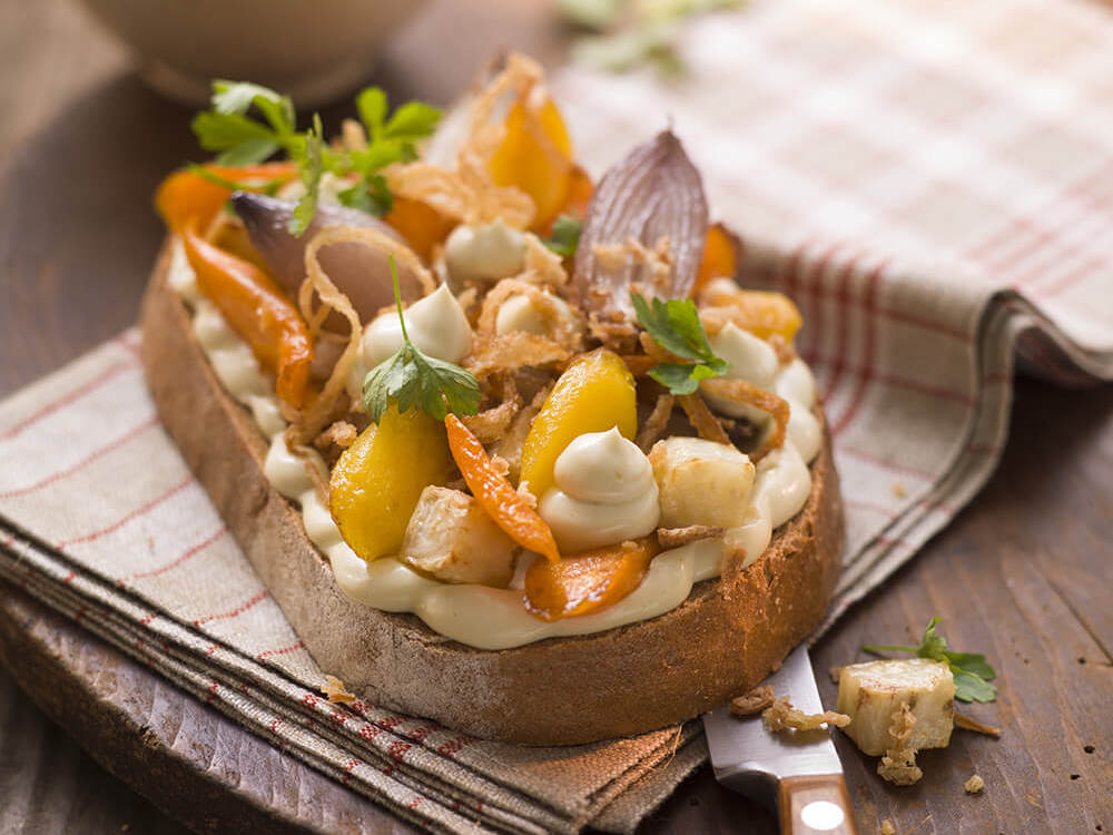 Den Backofen auf 180°C vorheizen. Das Gemüse putzen, schälen und in mundgerechte Stücke schneiden. Mit Salz, Pfeffer und etwas Zucker würzen. Mit dem Öl mischen und in einer Auflaufform im Ofen 30-40 Min. rösten. Zum Schluss die Butter unterrühren und etwas abkühlen lassen. Die Petersilienblätter abzupfen, waschen und trocken tupfen. Die Kräutercreme in einer Schüssel glattrühren und in einer Spritzbeutel mit kleiner Lochtülle füllen. Die Brotscheiben mit jeweils etwas Schmorgemüse belegen. Kleine Tupfen von der Kräutercreme darauf spritzen. Mit Petersilienblättchen und Röstzwiebeln bestreut servieren.