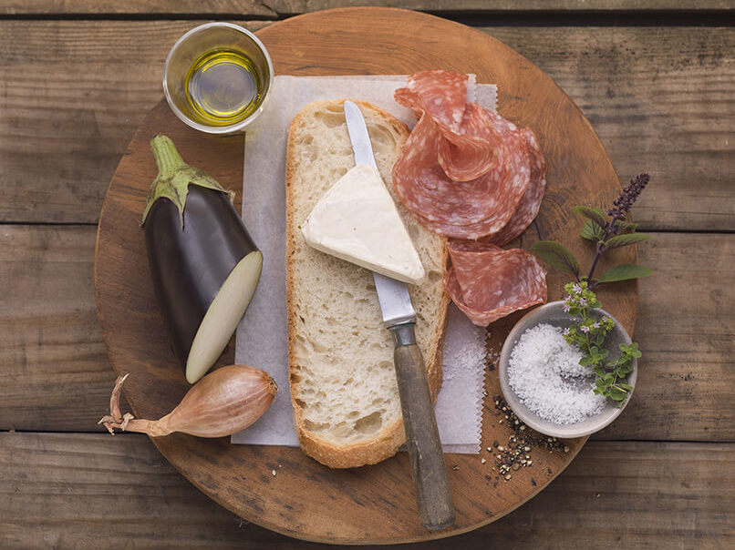 Die Brotscheiben in einer großen Pfanne oder Grillpfanne von beiden Seiten goldbraun rösten und abkühlen lassen. Edelcreme in einer kleinen Schüssel glatt rühren. Die Brotscheiben jeweils mit etwas Creme bestreichen. Die Schalotten schälen, halbieren und fein würfeln. Aubergine waschen und in 1,5 cm große Würfel schneiden. Mit etwas Salz würzen, Wasser ziehen lassen und dann trocken tupfen. Das Öl erhitzen und die Auberginen gut anbraten. Dann Schalotten dazugeben und bei niedriger Hitze weich schmoren lassen. Mit Salz, Pfeffer und Rosmarin würzen. Die Champignons putzen und in feine Scheiben schneiden oder hobeln. Basilikumblätter waschen und abzupfen. Den Rest der Creme in einen Spritzbeutel mit kleiner Lochtülle füllen. Die Brotscheiben jeweils mit Auberginen, Salami, Basilikumblätter sowie den Edelcremetupfen belegen und servieren.