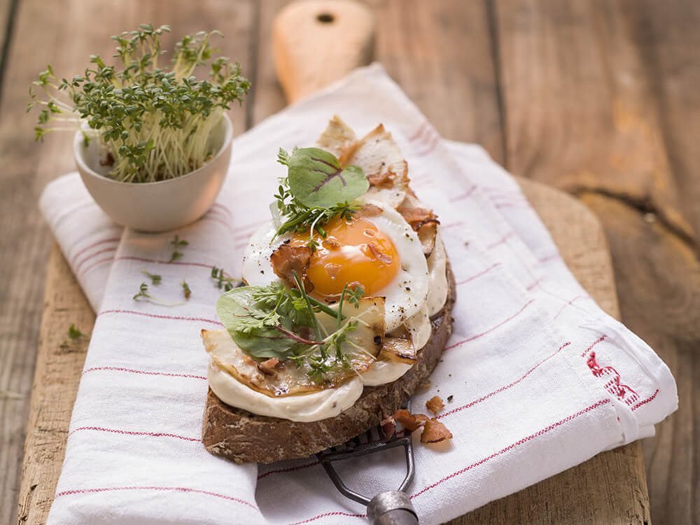Den Backofen auf 180°C vorheizen. Den Sellerie putzen, schälen, vierteln und in 0,5 cm dicke Scheiben schneiden. Mit Salz, Pfeffer und etwas Zucker würzen. Mit 1 El. Öl mischen und in einer Auflaufform im Ofen 20-30 Min. rösten, anschließend etwas abkühlen lassen. Das restliche Öl in einer Pfanne erhitzen und den Speck darin knusprig braten. Auf Küchenpapier abtropfen lassen. Im Bratfett die Eier aufschlagen und braten. Den Speck dann in feine Stücke hacken. Die Kräuterblätter waschen, trocken tupfen und grob zupfen. Die Kresse mit einer Schere schneiden und mit den Kräutern in eine Schüssel geben. Essig, Honig und Olivenöl mischen. Mit Salz und Pfeffer würzen und den Kräutersalat damit marinieren. Die Brotscheiben mit der Edelcreme bestreichen und mit je einem Spiegelei belegen. Mit Kräutersalat und Baconstücken bestreut servieren.