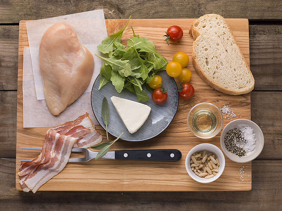 Den Backofen auf 140°C vorheizen. Die Hähnchenbrustfilets waschen und trocken tupfen. Mit wenig Salz und Pfeffer würzen und mit jeweils 2 Salbeiblättern belegen. Dann in den Frühstücksbacon einwickeln. Das Öl in einer Pfanne erhitzen und die Saltimbocca 2-3 Min. bei mittlerer Hitze knusprig braten. Im Ofen 6-8 Min. zu Ende garen. Die Kirschtomaten waschen und in Scheiben schneiden. Den Rucola waschen und trocken tupfen. Den restlichen Salbei und die Pinienkerne im Bratenfett kurz anrösten. Die Toskanabrotscheiben jeweils mit der Sahnecreme bestreichen. Die Saltimbocca in dünne Scheiben aufschneiden und mit den Tomatenscheiben und dem Rucola belegen. Mit Salbei und Pinienkernen bestreut servieren.